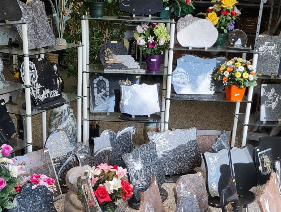 Découvrez en agence, une collection unique d’articles funéraires, plaques granit ou altuglass, fleurs artificielles ainsi que nos services d’entretien et de rénovation de sépulture.